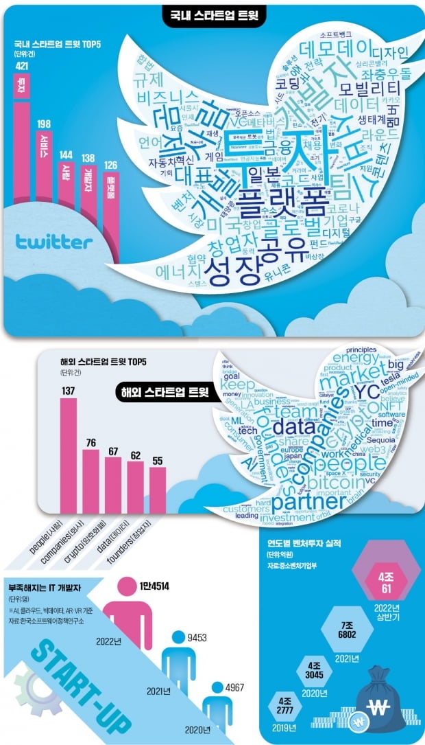 스타트업 업계의 관심 분야와 트렌드를 엿볼 수 있는 대표적인 창구가 사회관계망서비스(SNS)다. 한국경제신문의 스타트업 미디어 플랫폼 환경 긱스(Geeks)가 7일 국내외 스타트업 업계의 트윗 7342건을 분석한 결과 최근 최대 관심사는 역시 ‘투자’였다. 투자 관련 트윗 건수가 421건으로 가장 많이 언급됐다. 이 밖에 ‘라운드’ ‘데모데이’ ‘펀드’ 등 자본 유치와 관련한 단어가 많이 등장했다. 특히 올 들어 투자 시장이 빠르게 위축되면서 ‘돈 가뭄’에 대한 우려와 경계의 목소리가 컸다.