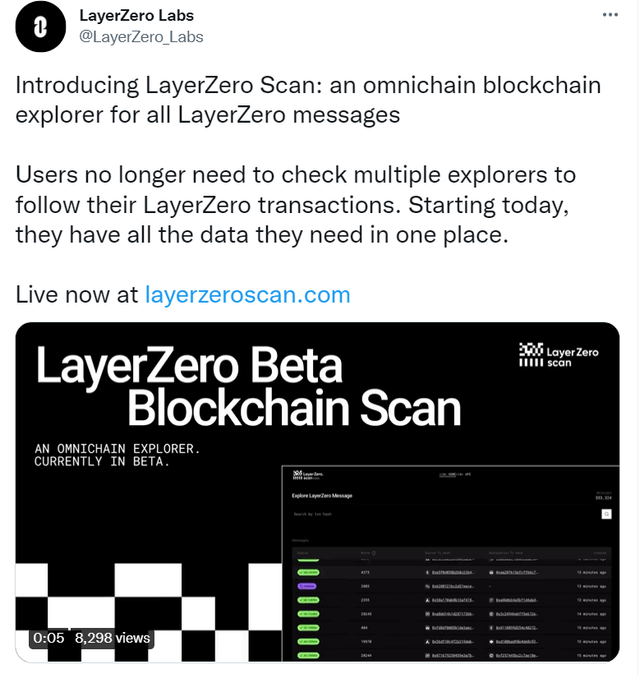 크로스체인 메시징 프로토콜 레이어제로(LayerZero) 랩스가 7일(현지시간) 공식 트위터를 통해 풀체인(옴니체인) 블록체인 브라우저인 레이어제로 스캔(LayerZero Scan)을 출시했다고 발표했다.