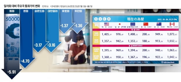 최근 원·달러 환율의 상승 속도가 과도하다는 지적도 있었다. 지난 7월 한국은행이 사상 처음으로 빅스텝(기준금리를 한 번에 0.5%포인트 인상)에 나선 이후 이달 7일까지 달러 대비 원화 가치는 5.91% 떨어졌다. 이 기간 일본 엔화(-4.7%), 중국 위안화(-1.36%), 유럽연합 유로화(-1.37%) 등과 비교해도 가치 하락이 두드러진다.