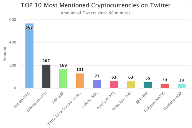 4위~10위에는 테라 루나 클래식(LUNC, 131회), 솔라나(SOL, 73회), 에이프 코인(APE, 63회), 시바이누(SHIB, 63회), 바이낸스코인(BNB, 55회), 폴리곤(MATIC, 39회), 카르다노(ADA, 38회) 등이 이름을 올렸다.