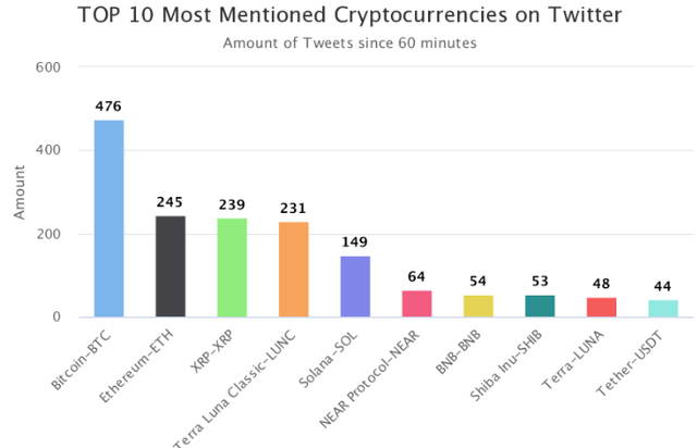4위~10위에는 테라 루나 클래식(LUNC, 231회), 솔라나(SOL, 149회), 니어 프로토콜(NEAR, 64회), 바이낸스코인(BNB, 54회), 시바이누(SHIB, 53회), 테라(LUNA, 48회), 테더(USDT, 44회) 등이 이름을 올렸다.