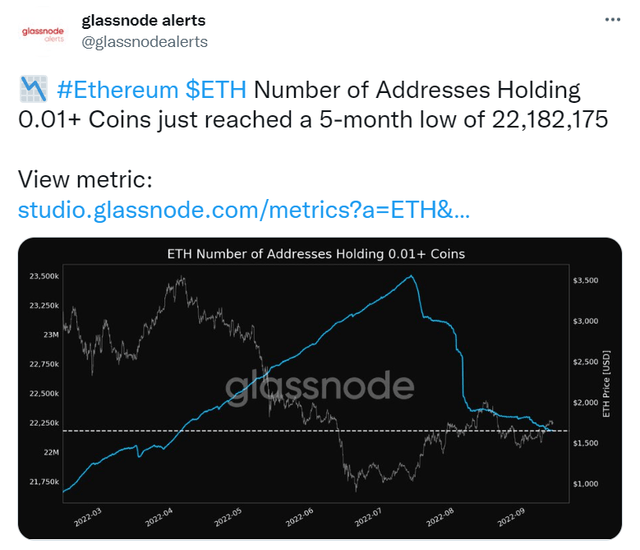 12일(현지시간) 글래스노드 데이터에 따르면 0.01 이더리움(ETH) 이상 보유한 이더리움 주소 수가 2218만2175개로 5개월래 최저 수준을 기록했다.
