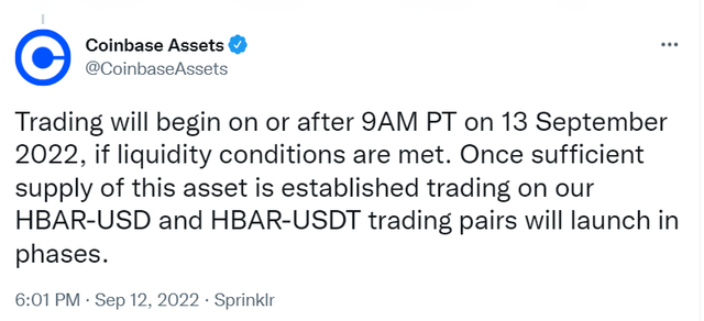 코인베이스, 헤데라(HBAR) 상장입력 오후 5:30 · 2022. 09. 12.기사출처김정호 기자00공유하기링크 복사텔레그램엑스카카오톡12일(현지시간) 글로벌 가상자산(암호화폐) 거래소 코인베이스가 헤데라(HBAR)을 상장한다고 공지했다. 유동성 조건 충족시 태평양 표준시(PT) 기준 9월 14일 오전 1시(한국시간)에 거래가 시작된다.HBAR김정호 기자reporter1@bloomingbit.io안녕하세요 블루밍비트 기자입니다.
