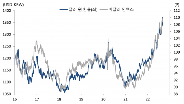 잭슨 홀 미팅 이후 미달러의 일방 독주가 더욱 거세지고 있다. 달러당 1300원을 넘었을 때만해도 너무 빠른 상승이라는 경계감도 적지 않았으나, 1350원을 어렵지 않게 넘어서고 1380원대로 직행하자 이제 1400원을 경고하는 목소리도 여기저기서 들리고 있다. 달러 인덱스(DXY)가 어느덧 110포인트선까지 올라서며 달러 강세를 어느 누구도 쉽게 거스르지 못하고 있기 때문이다.