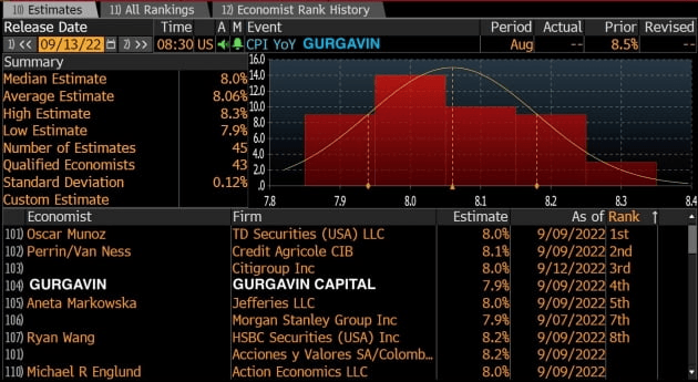 8월 CPI에 대한 컨센서스는 헤드라인 수치 기준 전년 대비 8.1%, 전월 대비 -0.1%입니다. 지난 7월의 8.5%, 0.0%보다 낮습니다. 헤드라인의 하락은 휘발유 등 에너지 가격 하락에 의한 부분이 큽니다.