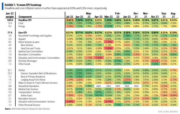 골드만삭스는 헤드라인 수치를 8.0%, -0.13%로 예상합니다. 또 근원 수치는 6.1%와 0.32%로 추정합니다. 골드만삭스는 "낮아진 유가(전월 대비 -5%)에 이로 인한 항공료의 추가 하락, 그리고 공급망 혼란 완화에 따른 자동차 분야의 상승 둔화(신차 +0.75%, 중고차 -1.25%)를 반영한 것"이라고 밝혔습니다. 골드만삭스는 "하지만 유리는 서비스 분야의 임금 상승 압력으로 인해 여전히 강한 인플레이션이 이어질 것"이라고 밝혔습니다. 골드만은 특별히 주거비(렌트 +0.65%, OER-등가임대료 0.55%) 강세와 신학기 교육비 상승(0.6%)을 예상한다고 지적했습니다. 또 자동차 보험료도 상승했다고 덧붙였습니다.