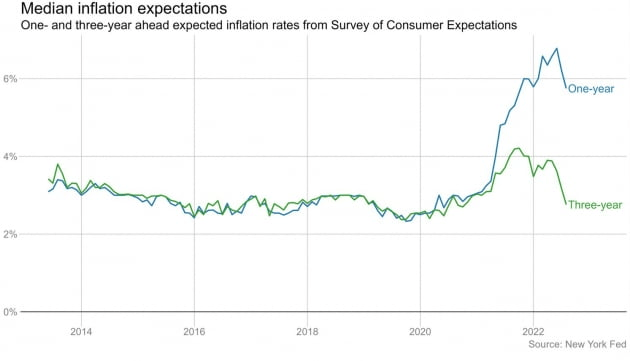 아침 10시 발표된 뉴욕 연방은행의 8월 소비자 기대 조사 결과는 이런 인플레이션 둔화 기대를부채질했습니다. 단기(1년), 중기(3년), 장기(5년) 인플레이션 기대치의 중앙값이 각각 5.7%와 2.8%, 2.0%로 지난 7월의 6.2%와 3.2%, 2.3%에 비해 각각 낮아진 것입니다.