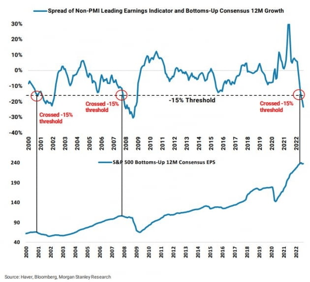 '비관론자' 모건스탠리의 마이크 윌슨 최고투자책임자(CIO)는 그동안 S&P500 기업들의 주당순이익(EPS) 둔화가 다음 내림세를 이끌 것이라고 주장해왔습니다. 윌슨은 오늘 보고서에서 "EPS 하락이 실제 일어날 때까지 시장이 전술적으로 잠재적으로 버텨낼 수 있다는 견해에 약간 공감하고 있다"라고 밝혔습니다. 최근 발표된 미국의 학자금 대출 탕감과 영국의 에너지 보조금은 현재 '분위기'가 유지될 수 있도록 하는 상당한 재정 부양책이라고 설명했습니다. 하지만 그는 "빠르면 앞으로 2~3개월 동안 ESP 하향 조정이 본격적으로 진행될 것이라고 확신한다. 9월 중순에서 10월은 EPS 수정에 있어 특히 어려운 시기"라고 지적했습니다.
