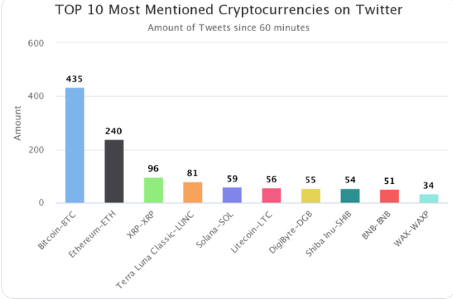 14일 가상자산(암호화폐) 마켓 데이터 플랫폼 코인트렌즈닷컴(CoinTrendz.com)에 따르면 이날 오후 1시 기준 1시간 동안 트위터에서 가장 많이 언급된 가상자산은 비트코인(BTC, 435회)으로 나타났다.