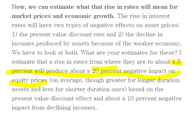 맞습니다. Fed가 긴축을 강하게 조일수록 금리는 높아지고 경제 성장을 제약하게 될 것입니다. 브릿지워터의 레이 달리오 설립자는 오늘 링크드인에 올린 글에서 실질 금리(1%)와 자신의 예상 인플레이션(향후 10년 4.5~5%)을 감안해 장단기 금리가 4.5~6%가 되어야 한다고 주장했습니다. 그는 "이는 민간 부문의 크레딧 성장을 낮추고 지출 감소를 가져오고 이에 따라 경제도 함께 하락할 것"이라며 "금리가 4.5%까지 오르면 주가에 약 20% 부정적인 영향을 미칠 것"이라고 덧붙였습니다. 달리오는 "금리가 6%가 되면 채무자, 시장 및 경제에 참을 수 없을 정도로 나쁘리라 생각하기 때문에 Fed가 그보다는 완화적으로 나설 것으로 추정한다"라고 설명했습니다.
