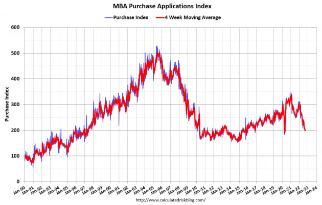 CPI로 돌아가겠습니다. 8월 수치처럼 앞으로도 주거비는 계속해서 CPI 상승의 주요 요인으로 작용할 것입니다. 하지만 스웡크가 지적했듯 주택 시장은 이미 가라앉고 있습니다. 오늘 모기지은행협회(MBA)에 따르면 모기지 평균 금리가 지난주 6.01%로 집계되어 2008년 이후 처음으로 6% 선을 넘었습니다. MBA는 모기지론 신청 건수를 나타내는 시장종합지수(Market Composite Index)도 1주일 전보다 1.2%, 1년 전보다 64.0% 하락했다고 밝혔습니다. 신규 주택 판매는 7월에 6년 내 최저치로 급락했으며 주택 판매 및 단독 주택 착공은 2년 최저치를 기록했습니다. 이렇게 주택 시장이 빨리 침체를 맞으면 주거비는 빨리 내려가지 않을까요?
