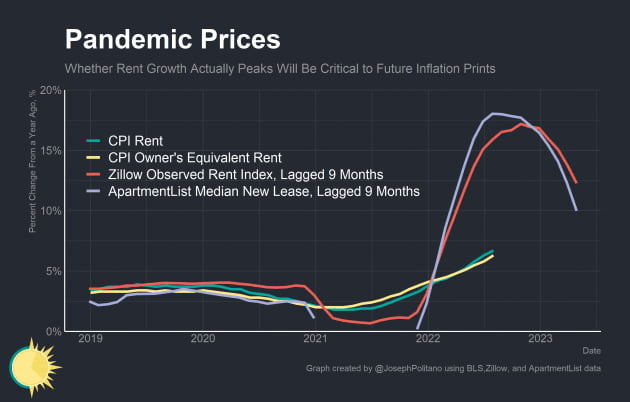 핌코는 "8월 렌트와 소유자 등가임대료(OER)가 전년 대비 6.3% 상승했는데, 상승세가 계속해서 가속화되어 최대 8%까지 오를 것으로 예상한다"라고 밝혔습니다. 핌코는 "역설적으로, Fed의 금리 인상은 역사적으로 처음에는 렌트를 상승시키는 경향이 있다. 주택 소유를 어렵게 만들기 때문이다. 주택 가격 인플레이션이 실질적으로 상당 폭 완화되기 시작해야 렌트도 하락하기 시작한다. 일반적으로 3~6분기가 걸린다. 또 주요 도시 이외 지역에서는 임대료 통제가 없으며, 새로 임대 계약을 할 때 훨씬 높은 렌트에 직면해 사람들이 기존 임대 계약을 비싸게 갱신하면서 렌트가 더 높아지고 있다. CPI를 발표하는 노동 통계국(BLS)은 임대 갱신과 신규 임대를 모두 조사하기 때문에 렌트 인플레이션이 더 높아졌다. 렌트가 CPI 바스켓의 많은 부분을 차지하며, 완화하는 데 시간이 걸릴 것이라는 점을 감안할 때 Fed는 앞으로 몇 분기 동안 어려운 과제에 직면할 것"이라고 밝혔습니다.