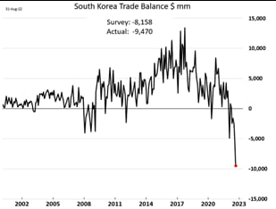 필자가 주목하는 것은 미국의 제조업과 소매업 업황이 급격히 악화되고 있다는 점이다. 반면, 미국경제의 80% 가량을 차지하고 있는 서비스부문은 가계의 소비패턴이 상품에서 서비스로 옮겨가면서 과열 상태이다. 결국, 총수요를 억제해야하는 연준은 제조업의 침체에도 불구하고 서비스부문이 충분히 둔화될 때까지 긴축정책을 쓸 수 밖에 없다. 우리나라와 대만을 비롯해 글로벌 공급망에 위치하여 상품수출 비중이 큰 경제는 미국의 제조업과 소매업의 침체로 수출업황의 급격한 악화가 불가피하며 따라서 경기의 전반적 침체를 겪을 수 밖에 없다. 실제 우리나라의 지난달 무역수지는 94억 7천만달러 적자를 기록하며 관련 통계 작성 역사상 월간 적자 최대 기록을 경신했다. 수출은 물량이 늘지 않으며 지난해 같은 기간보다 6.6% 늘어난 반면 원유가 하락에도 수입은 28.2% 늘어난 것으로 나타났다.