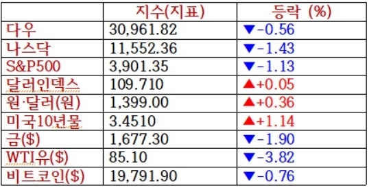 이날 뉴욕증시 3대 지수는 장 초반만 해도 시장 예상을 웃도는 소비 지표를 등에 업고 상승했으나 이내 하락 전환했다. 미 연방준비제도(연준·Fed)의 공격적인 기준금리 인상 우려에 인플레이션 장기화 공포가 확산하며 투자심리가 위축됐다는 평가다. 투자자들은 경제 지표 발표를 지켜보며 다음 주로 예정된 연준의 통화정책회의를 주시하고 있다.