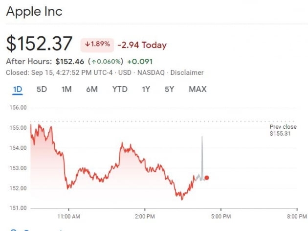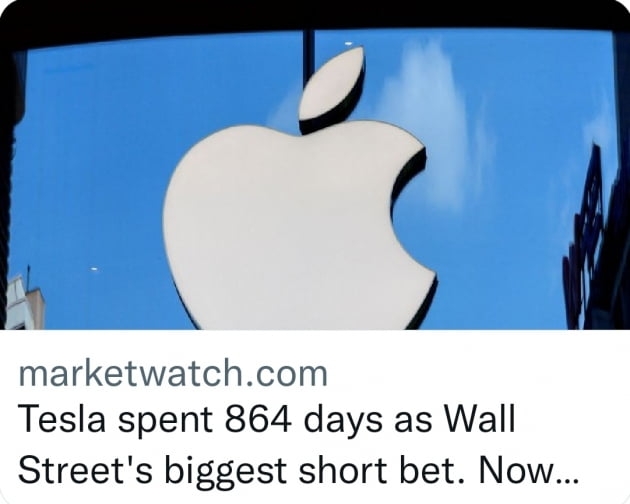 오늘 월가에서 가장 많이 회자된 건 '애플이 테슬라를 제치고 공매도 대상 1위 기업이 됐다'라는 마켓워치의 기사였습니다. 이 여파로 애플은 오늘 1.89%나 하락했습니다. 한때 2.5%까지 미끄러지기도 했습니다. 반면 테슬라는 0.38% 상승세로 마감됐습니다.