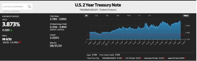 결국, Fed의 매파적 움직임을 막을만한 경제 지표는 없었습니다. 기준금리에 민감한 2년물 국채 금리는 지속해서 상승하더니 전날보다 8.9bp나 오른 3.873%를 기록했습니다. 역시 2007년 이후 최고치입니다. 한때 3.890%까지 올랐습니다. 월가 관계자는 "파월 의장이 '높은 금리를 유지하겠다(higher for longer)고 밝힌 뒤 최종금리 예상이 계속 상승하고 있다. 정책금리가 4% 가는 게 기정사실로 되었으니 2년물 금리가 금세 4%를 넘어도 이상할 건 없을 것 같다"라고 말했습니다. 실제 오늘 1년물 국채 수익률은 4%를 잠시 돌파하기도 했습니다. 10년물도 4.1bp 올라 3.449%를 기록했습니다. 한때 3.469%까지 올라 연고점(3.48%)을 다시 두드렸습니다. CNBC의 릭 산텔리 채권 해설가는 "10년물이 이 수준을 넘게 되면 기술적으로 매도 신호가 된다"라고 말했습니다.