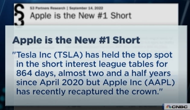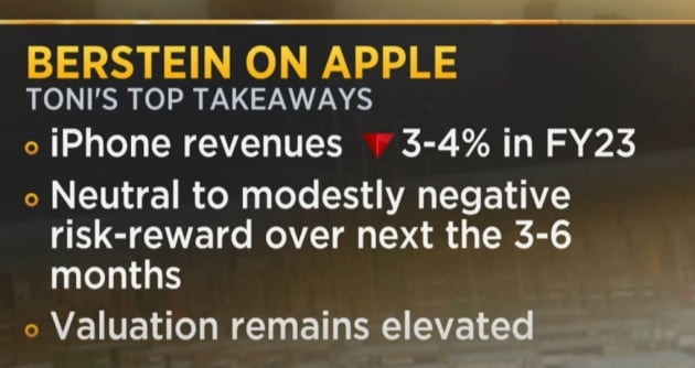 얼라이언스 번스타인의 토니 사코나기 애널리스트(IT 하드웨어)는 CNBC 인터뷰에서 "애플은 통상 9월에 새로운 아이폰을 내놓는데, 이번 판매 주기가 좋을지 아닐지 예상이 엇갈리면서 불확실성이 커진다. 그래서 공매도를 취하는 사람들이 있을 수 있다고 생각한다. 또 애플은 팬데믹에서 큰 수혜를 입었다. 2021년과 2022년 영업이익은 이전보다 60%나 증가했다. 그리고 내년에 애플의 성장은 그보다 더 낮아질 수 있다고 생각한다. 우리는 조금 더 보수적이다. 현재 수준에서 애플에 대한 위험보상은 중립적이거나 약간 부정적이라고 생각한다"라고 말했습니다.