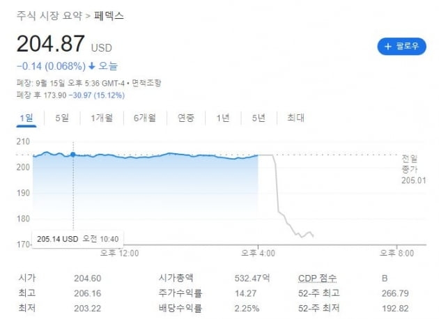오늘 페덱스는 장 마감 뒤 월가 예측보다 낮은 분기(~8월 31일) 실적을 잠정 발표한 후 시간 외 거래에서 15% 하락하고 있습니다. 주당순이익(EPS)은 3.44달러로 예측 5.14달러에 크게 못 미쳤고 매출도 232억 달러로 예상 236억 달러를 밑돌았습니다. 페덱스는 "분기 후반에 글로벌 및 미국에서 거시 경제 추세가 크게 악화하면서 글로벌 거래량이 감소했다"라며 고용 동결, 90곳 사무실 폐쇄, 일부 화물용 비행기 운항 중지, 일요일 지상 운영 축소 등 비용 절감 조처를 하고 있다고 밝혔습니다. 페덱스는 다음 분기 가이던스로 EPS 2.75달러, 매출 235억~240억 달러를 제시했는데 이는 월가 예상(5.48달러, 248억6000만 달러)보다 훨씬 낮습니다. 사토리펀드의 댄 나일스 설립자는 페덱스의 향후 가이던스 하향 조정에 대해 "물류 회사는 광범위한 제품을 나르는 좋은 경제 지표"라면서 우려했습니다.