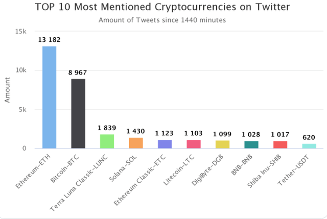 4위~10위에는 솔라나(SOL, 1430회), 이더리움 클래식(ETC, 1123회), 라이트코인(LTC, 1103회), 디지바이트(DGB, 1099회), 바이낸스코인(BNB, 1028회), 시바이누(SHIB, 1017회), 테더(USDT, 620회) 등이 이름을 올렸다.