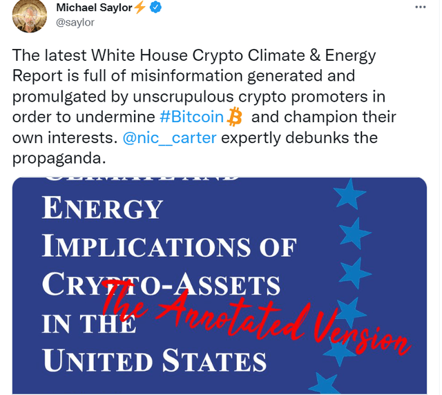 마이클 세일러(Michael Saylor) 마이크로스트래티지 임원이 16일(현지시간) 자신의 트위터를 통해 백악관이 내놓은 가상자산(암호화폐) 기후 및 에너지 보고서는 잘못된 정보로 가득 차 있다고 밝혔다.