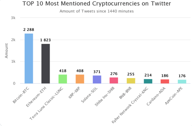 4위~10위에는 리플(XRP, 408회), 솔라나(SOL, 371회), 시바이누(SHIB, 276회), 바이낸스코인(BNB, 255회), 카이버네트워크(KNC, 214회), 카르다노(ADA, 186회), 에이프코인(APE, 176회) 등이 이름을 올렸다.