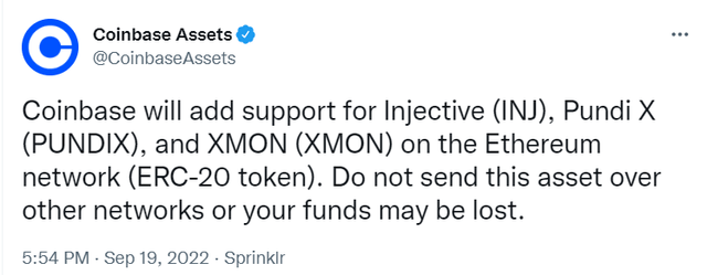 글로벌 가상자산(암호화폐) 거래소 코인베이스가 19일(현지시간) 공식 트위터를 통해 인젝티브(INJ), 펀디 엑스(PUNDIX), XMON(XMON)를 상장한다고 공지했다.