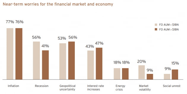 글로벌 투자은행(IB) 씨티그룹이 약 125곳의 패밀리오피스를 상대로 설문을 실시해 발표한 '패밀리오피스 서베이 보고서 2022'에 따르면 이들은 3대 우려 포인트로 물가 상승(76%), 불황에 대한 두려움(54%), 지정학적 불확실성(53%)을 꼽았다. 패밀리오피스는 거대 부호 가문의 자산을 대신 운용해주는 자산관리서비스다. 설문에 응답한 패밀리오피스의 26%는 10억달러 이상의 투자자산을 운용하고 있는 곳으로 나타났다. 응답자의 절반은 5억달러 이상의 자산을 운용하는 곳이다.