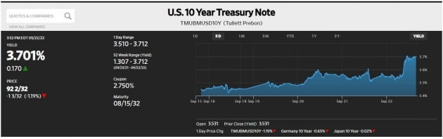 아침부터 뉴욕 채권시장에서는 금리가 치솟았습니다. 미 국채 10년물 금리는 한때 20bp가량 폭등한 3.712%까지 올랐고, 2년물 수익률도 4.169%까지 상승했습니다. 각각 2011년, 2007년 이후 최고 수준입니다. 10년물은 6월 이후 하루 최대 상승률을 보였습니다. 오후 들어 소폭 상승 폭을 되돌리면서 3시 40분께 10년물은 전날보다 17bp 급등한 3.701%, 2년물은 8.7bp 오른 4.127%를 기록했습니다.