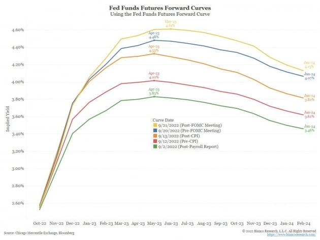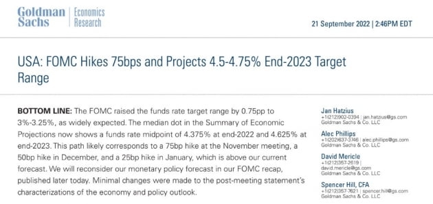 골드만삭스는 점도표를 보면 11월 75bp 인상이 기준선임을 시사하는 데 이는 기대보다 매파적이라고 봤습니다. 또 경제전망(SEP)에서 최고 실업률을 내년 4.4%로 제시했는데, 이는 인플레이션이 높게 유지되면 계속 금리를 올릴 의향이 크다는 것으로 해석했습니다.
