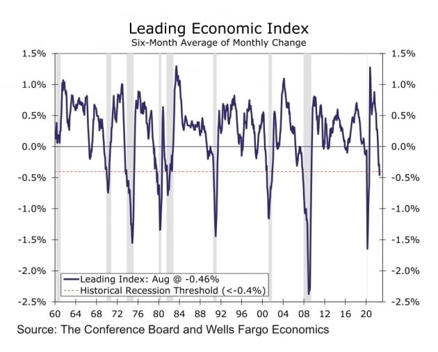 오늘 콘퍼런스보드가 발표한 8월 경기선행지수는 전월보다 0.3% 내린 116.2를 기록하면서 6개월 연속 하락해 경기 침체 우려를 키웠습니다. 예상은 -0.1%였습니다. 콘퍼런스보드는 "경기선행지수가 여섯 달째 하락한 것은 잠재적 경기 침체를 시사한다"라며 몇 분기 안에 침체가 발생할 것이라고 분석했습니다.