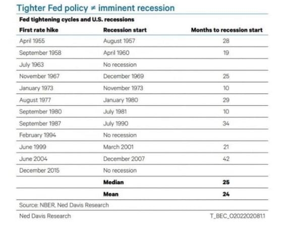 실제 역사를 보면 Fed가 긴축을 통해 미국 경제를 연착륙시킬 확률은 그리 높지 않습니다. 네드데이비스 리서치에 따르면 1955년 이래 12번의 기준금리인상 주기(3회 이상 금리 인상이 이어진 경우)가 있었는데 이 가운데 9번은 경기 침체로 이어졌고, 세 번 만 침체를 면할 수 있었습니다. 통상 첫 번째 금리 인상 후 첫해는 경제가 좋았지만 1년 차가 지나면 둔화하기 시작했습니다. 그리고 중앙값으로 25개월 뒤에 침체가 시작됐습니다.