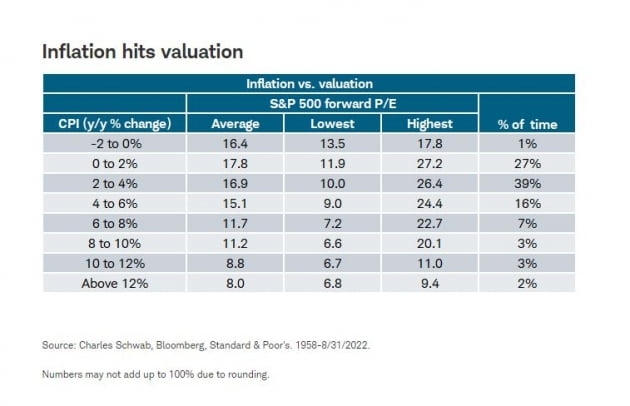 지금 기업들의 가장 큰 어려움은 인플레이션이겠지요. 찰스 슈왑은 밸류에이션이 인플레이션의 벽에 부딪힐 것으로 봤습니다. 과거 CPI가 지금처럼 6~8% 사이일 경우 평균 P/E는 11.7%에 불과했습니다. CPI가 높을수록 P/E가 낮고, CPI가 0~2% 사이일 때 가장 높습니다.