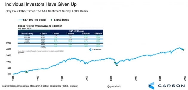 오늘 발표된 향후 미국 개인투자자협회(AAII)의 투자자 조사에서 향후 6개월 동안 주가가 하락할 것으로 보는 약세 심리는 60.9%를 기록했습니다. 60%를 넘은 건 1987년 조사가 시작된 이래로 이번까지 다섯 번밖에 없습니다. 개인투자자들이 증시를 매우 부정적으로 보는 겁니다. 이와 관련, 칼슨그룹의 라이언 디트릭 전략가는 "과거 AAII의 투자자 심리가 이렇게 부정적일 때 투자하면 향후 12개월 뒤 모든 경우에 돈을 벌었고 평균 수익률은 33%에 달했다"라고 밝혔습니다. 역발상 투자에 좋은 지표라는 얘기입니다. 베스포크 인베스트먼트는 S&P500 지수가 이날 극도로 과매도 된 상황이 됐다고 분석했습니다. 50일 이동평균선과의 차이가 2 표준편차 수준까지 낮아진 것입니다. 기술적으로는 단기적으로는 반등할 수 있는 상황으로 볼 수도 있겠습니다.