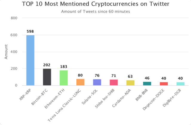 23일 가상자산(암호화폐) 마켓 데이터 플랫폼 코인트렌즈닷컴(CoinTrendz.com)에 따르면 이날 오후 1시 기준 1시간 동안 트위터에서 가장 많이 언급된 가상자산은 리플(XRP, 598회)로 나타났다.