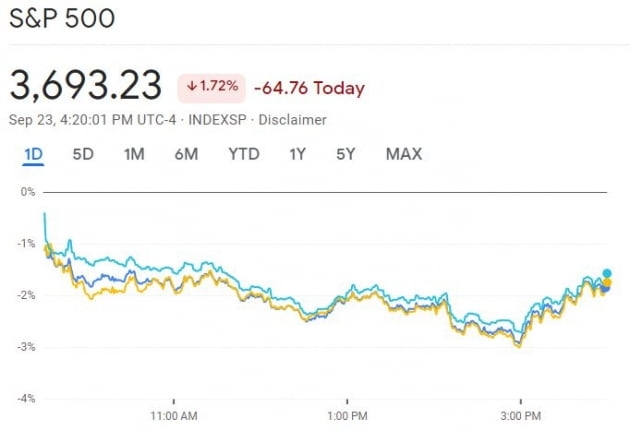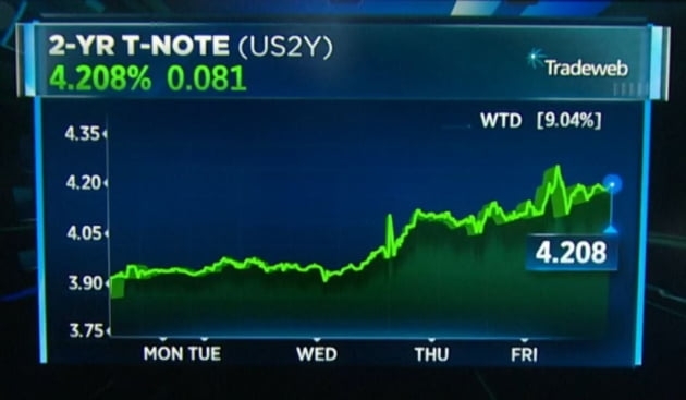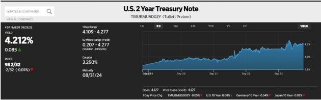 23일(미 동부시간) 뉴욕 금융시장엔 긴장감이 가득했습니다. 뭔가 터질 것 같은 그런 분위기였습니다. 증시에 앞서 개장한 채권 시장에서부터 위기감이 느껴졌습니다. 어제 연 3.7%를 넘은 미 국채 10년물 금리는 오늘 아침 3.827%까지 뛰었습니다. 전날 4.17%까지 올랐던 2년물 수익률은 장중 4.277%까지 솟구쳤습니다. 매일 10bp, 20bp씩 요동치는 상황입니다.