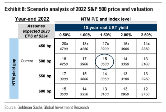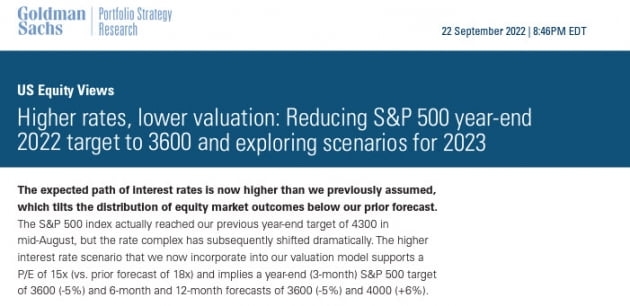 골드만삭스는 어젯밤 보고서에서 S&P500 지수의 연말 목표치를 기존 4300에서 3600으로 낮췄습니다. 9월 FOMC에서 나온 점도표를 보면 기준금리가 기존 예상보다 50bp 더 높아질 것이라는 게 이유입니다. 그래서 S&P500 지수의 주가수익비율(P/E)을 18배에서 15배로 조정하면서 목표 주가를 내린 것입니다. 골드만은 향후 6개월 전망치도 3600으로 유지했고 12개월 뒤 4000을 내다봤습니다.