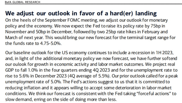 월가에는 이런 매파적 Fed로 인한 침체 걱정이 가득합니다. 뱅크오브아메리카는 오늘 "이제 미국 경제가 더 강하게 경착륙할 것으로 본다"라며 내년 1분기부터 침체를 예고했습니다. 내년 성장률은 -1%로 예상했으며 실업률은 내년 4분기 5.6%에 달할 것으로 봤습니다. 그동안 5%로 내다본 것을 더 높게 수정한 것입니다. 웰스파고도 "2023년 1분기부터 경기 침체가 시작되어 3분기 연속 마이너스 실질 GDP 성장률을 기록한 뒤 내년 4분기에나 성장이 플러스로 돌아설 것"이라고 전망했습니다. UBS는 "기준금리 4%가 미국 경제가 견딜 수 있는 최고 수준으로 생각하는데, Fed가 이 수준 이상으로 금리를 올리겠다고 위협하고 있다"라며 "Fed가 기준금리를 5% 가까이 인상한다면 경기 침체를 피하기 어려울 것"이라고 밝혔습니다.