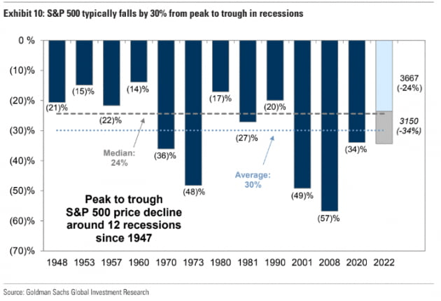 침체가 닥친다면 주가는 더 내려갈 수 있습니다. 골드만삭스는 어제 S&P500 지수 전망치를 3600으로 내렸지만, 경착륙 시나리오에서는 기업 이익 하락이 불가피하다며 6개월 내 지수가 3150까지 떨어질 수 있다고 제시했습니다. 데이비드 코스틴 전략가는 "고객들과 논의한 바에 따르면 대부분의 주식 투자자는 경착륙 시나리오가 불가피하다고 보고 잠재적 경기 침체의 시기, 규모 및 지속 기간 등에 따른 투자 전략에 초점을 맞추고 있다"라고 밝혔습니다. 골드만삭스는 통상 경기 침체가 오면 S&P500 기업 이익이 최대 30%가량 감소하는 것으로 분석했습니다. 이는 뱅크오브아메리카는 그보다 약간 적은 -19.1%로 추정하고 있습니다.
