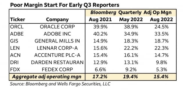이익 하락 조짐은 강해지고 있습니다. 웰스파고가 이미 3분기 실적(~8월)을 발표한 오라클 어도비 제너럴밀스 등 7개 기업의 실적을 모아봤더니 이들의 영업 마진은 15.4%로 나타나 지난 2분기 19.4%나 작년 동기의 17.2%보다 감소한 것으로 나타났습니다. 팩트셋에 따르면 월가의 3분기 S&P500 기업들의 이익 추정치는 전년 대비 3.2% 증가로 지난 6월 30일 9.8%보다 크게 낮아졌습니다. 사실 에너지 기업을 제외한 3분기 이익 증가율은 -3.1%로 추정되고 있습니다.