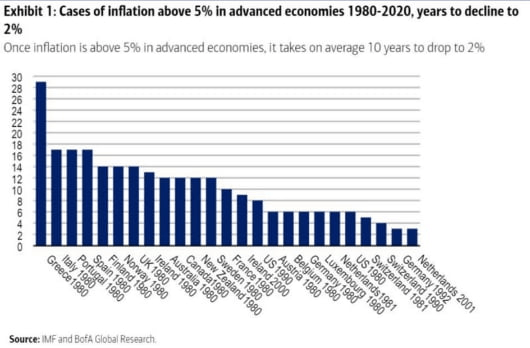 하지만 인플레이션이 그렇게 쉽게 떨어질지는 불투명합니다. 재닛 옐런 미국 재무부 장관은 어제 "내년에는 분명히 물가가 떨어지겠지만, 위험이 있다. 러시아의 우크라이나 침공이 끝나지 않았고 러시아는 원유와 가스를 무기화하고 있다. 인플레이션 목표가 2%인데, 아마도 우리는 내년에 거기에 도달하지는 못할 것"이라고 말했습니다. 뱅크오브아메리카에 따르면 1980년부터 2020년까지 40년간 세계 선진국에서 인플레이션이 5%를 넘었을 경우 다시 2%까지 돌아오는 데는 평균적으로 10년이 걸렸습니다. 가장 빠른 게 독일의 1992년과 네덜란드 2001년인데 각각 3년이 소요됐습니다. 블룸버그의 지난 8월 투자자 대상 설문에서도 Fed가 인플레이션을 2%로 되돌리는 데 2년이 소요될 것이라고 답한 이가 46.4%, 그 이상이 걸릴 것이라고 한 게 39.0%로 대다수였습니다.
