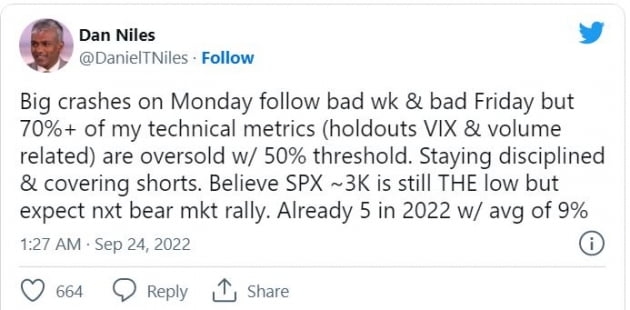 잭슨홀 연설 이후 S&P500 지수는 10% 이상 내렸습니다. 사토리 펀드의 댄 나일스 설립자는 "시장이 과매도 상태이며 또 다른 약세 시장 랠리가 예상된다"라는 트윗을 띄웠습니다. 그는 "여전히 S&P500 지수의 바닥은 3000으로 추정하지만 베어마켓 랠리가 예상된다. 올해 그런 랠리가 이미 다섯 번 있었고 평균 지수는 9% 상승했다"라고 언급했습니다. 오늘 변동성 지수(VIX)는 한때 30을 넘어 3개월 만에 최고로 치솟았습니다. 데이터트랙 리서치에 따르면 올해 VIX가 30을 넘어설 때마다 단기 바닥을 만들었습니다.