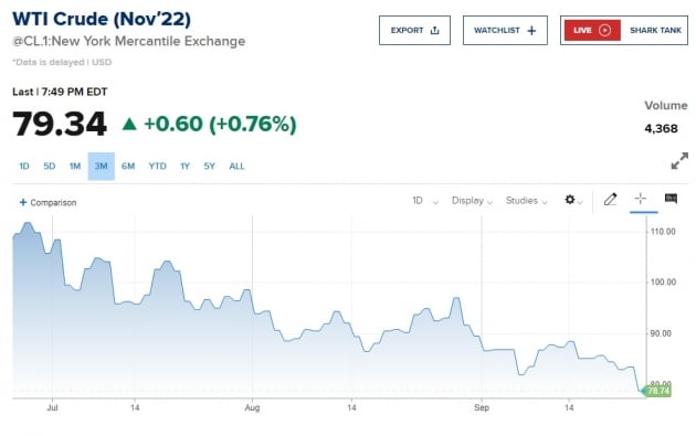 23일(현지시간) 뉴욕상업거래소에서 서부텍사스산원유(WTI) 11월물의 배럴당 가격은 전일보다 5.69%(4.75달러) 떨어진 78.74달러를 기록했다. 이 가격이 80달러 밑으로 떨어진 건 지난 1월 이후 처음이다. 러시아의 우크라이나 침공으로 인한 유가 상승분이 모두 없어졌다는 얘기다. WTI 가격은 지난주 4주 연속으로 하락했다. 올해 가장 긴 하락 폭이다.