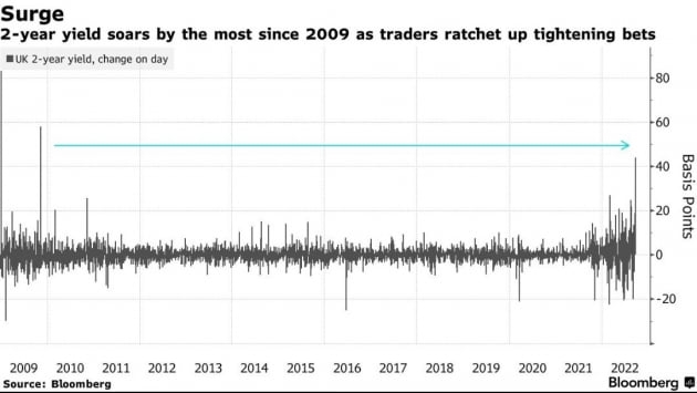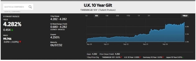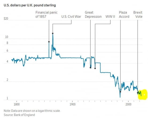 영국이 지난주부터 불안의 진원지가 되고 있습니다. 영국 파운드화는 오늘 한때 4.9%까지 급락하며 1달러당 1.032파운드를 기록하기도 했습니다. 사상 최저 기록입니다. 이전 최저치는 1985년 2월 26일의 1.05달러였습니다. 지난 2007년 글로벌 금융위기 당시에도 최저 기록은 1달러당 1.3유로였습니다. 영국이 국민투표로 브렉시트를 결정했을 때도 1달러당 1.2파운드가 마지노선이었습니다. 환율만 보자면 지금이 그때보다 훨씬 심각한 상황입니다. 국채 금리도 폭등했습니다. 오늘 영국 국채 2년물 금리는 50bp 이상 올랐습니다. 금리가 높아지면 채권 가격은 낮아지지요. 10년물은 43bp 급등한 4.26%까지 올랐습니다. 불과 일주일 전만 해도 3.15%였습니다. 9월 들어 115bp가 상승했는데요. 이는 1957년 이후 가장 큰 폭의 상승입니다.