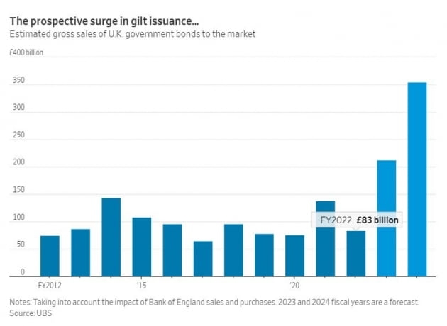 이는 영국 정부가 치솟은 에너지 가격이 가계 부담으로 전가되는 것을 막기 위해 2년간 1000억 파운드에 달하는 재정 지원안과 함께 5년간 1600억 파운드 규모의 감세안을 내놓은 게 원인입니다. 예산을 펑펑 쓰면서 감세한다면 국채를 많이 발행해야 합니다. 그래서 금리가 치솟은 것입니다. 거기에 지난주 통화정책회의를 연 영국은행은 기준금리를 50bp 올리는 데 그쳤습니다. 시장 기대(75bp)보다 낮았죠. 그래서 글로벌 투자자들이 영국 재정이 지속 불가능할 것이란 데 베팅하면서 파운드가 가치가 급락하고 채권 가격이 내려가고 있는 것입니다. 모하메드 엘 에리언 알리안츠 수석 고문은 "영국은행은 11월 예정된 통화정책 회의를 기다리면서 시장 기능 약화 및 인플레이션 폭등을 지켜볼 것인지, 아니면 예정에 없던 긴급회의를 열어 금리를 올릴 것인지 어려운 선택의 갈림길에 있다"라고 밝혔습니다. 시장은 영국이 11월까지 200bp를 추가 인상하는 데 베팅하고 있습니다. 그만큼 상황이 심각합니다.