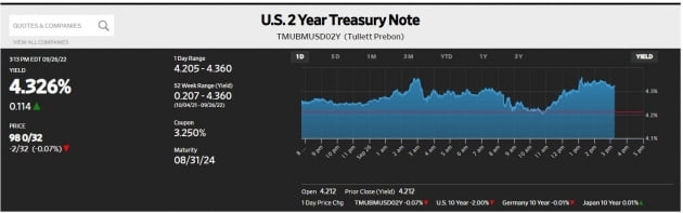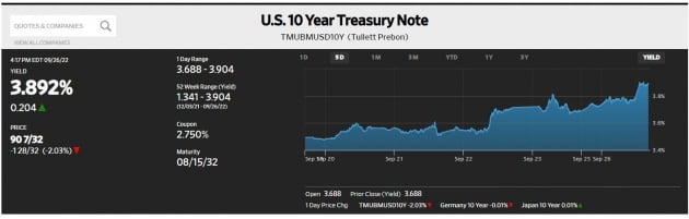 오전 11시께 미국 국채 금리는 조금씩 오르기 시작했습니다. 10년물 금리는 한때 3.904%까지 올랐습니다. 오후 4시 20분께 전장보다 20.4bp 폭등한 3.892%에 거래됐습니다. 2010년 이후 최고 수준입니다. 2년물 수익률은 11.8bp 상승한 4.33%를 기록했습니다. 한때 4.36%까지 올랐고요. 2007년 이후 최고치인 4.3%를 넘어선 것입니다. 월가 관계자는 "영국은행이 금리 인상을 할 줄 알았는데, 아무런 조치 없이 지켜보겠다고만 하니까 실망 매물이 쏟아졌다. 외국인뿐 아니라 내국인 투자자까지 채권을 내다 팔았고 금리는 폭등했다. 이는 미국 채권 시장에도 크게 영향을 줬다"라고 밝혔습니다. 오후 1시에 발표된 미 재무부의 2년물 입찰 결과도 부정적이었습니다. 낙찰 금리가 발행 당시 시장금리(WI)보다 1.4bp나 높게 형성됐습니다. 이는 2020년 2월 이후 가장 큰 수익률 격차입니다.