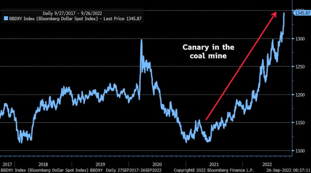 달러 강세가 극단으로 치닫자 글로벌 시장에서 뭔가 큰 사고가 생기고 위기가 만들어질 수 있다는 분석이 나오고 있습니다. 모건스탠리의 윌슨 전략가는 "이런 달러 강세는 역사적으로 일종의 금융/경제 위기를 초래했다"라며 "뭔가 부서질 게 있는지 경계할 때가 있다면 바로 지금일 것"이라고 말했습니다. 윌슨은 "더 놀라운 것은 다른 주요 중앙은행들도 역사적으로 빠른 속도로 긴축 정책을 펼치고 있음에도 불구하고 이런 달러 강세가 일어나고 있다는 것"이라고 덧붙였습니다. 윌슨은 올해 말이나 내년 초에 S&P500 지수가 3000~3400포인트 수준에서 바닥을 찾을 것으로 보고 있습니다. 찰스 슈왑의 캐시 존스 채권 전략가도 "외환 시장은 최근 추세가 지속 가능하지 않다는 신호를 보내고 있다. Fed의 긴축과 양적 긴축(QT)은 세계 시장에서 유동성을 고갈시키고 있다. 정치적 혼란, 에너지 위기 등등이 추가된다면 무언가 깨질 것"이라고 우려했습니다.