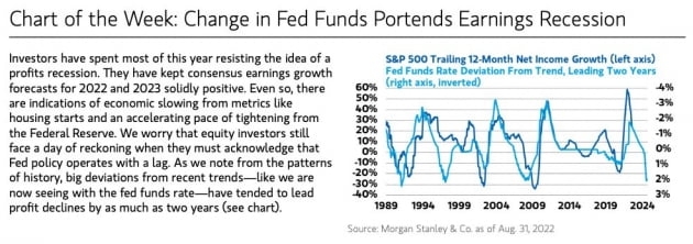 달러 강세는 미국 기업 이익에 부정적입니다. 모건스탠리는 "ICE 달러인덱스가 올해 들어 21% 상승했으며 계속 올라가고 있다. 인덱스가 1% 변화하면 S&P500 기업의 이익은 0.5% 감소하는 것으로 분석된다. 즉 4분기 S&P500 기업 이익은 약 10% 역풍을 맞게 될 것"이라고 밝혔습니다. 모건스탠리는 지금 상황은 위험자산이 랠리를 할 수 있는 상황이 아니라고 지적했습니다. 파이퍼 샌들러의 마이클 캔토로위츠 전략가는 "우리는 3분기 어닝시즌 문 앞에 있다. 세계 경제는 빠르게 둔화되고 있고 이번 어닝시즌은 세계 경제가 나은 모습을 보였던 지난 2분기처럼 친절하지 않을 수 있다. 지금 제조업 구매관리자지수(PMI)가 50 이하로 떨어진 나라가 53%로 지난 2분기의 23%보다 크게 늘었다"라고 분석했습니다. 웰스파고는 오늘 "2023년 상반기까지 지난 6월 저점을 재시험하지 않으리라고 봤는데, 이런 우리 전망은 틀렸다. 우리는 시장 바닥이 아직 나타나지 않았으며 연준이 더 긴축함에 따라 경기 침체가 오면 기업들의 EPS 추정치가 하락하고 2023년에는 주가가 저점을 더 낮출 것으로 본다"라고 밝혔습니다.