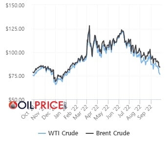 이날 뉴욕상업거래소(NYMEX)에서 서부텍사스원유(WTI) 선물 11월물은 전 장보다 2.3%(2.06달러) 하락한 배럴당 76.71달러로 마감했다. WTI 선물 가격은 1월 6일 이후 최저치를 찍었다. 브렌트유 선물 11월물은 2.4%(2.09달러) 내린 배럴당 84.06달러로 마감했다. 브렌트유 선물 가격은 1월 6일 이후 최저치였다.