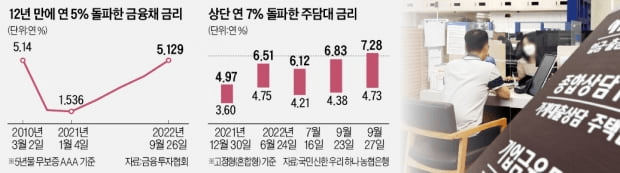 금융채 금리 상승은 변동형 주담대 금리의 기준이 되는 코픽스(COFIX·자금조달비용지수)도 끌어올린다. 은행이 매달 새로 조달한 자금이 기준이 되는 코픽스엔 예·적금 금리와 양도성예금증서(CD), 금융채 등이 영향을 미친다. 5대 시중은행의 이날 변동형 주담대 금리는 연 4.4∼6.82%로 상단이 연 7% 턱밑까지 올랐다.