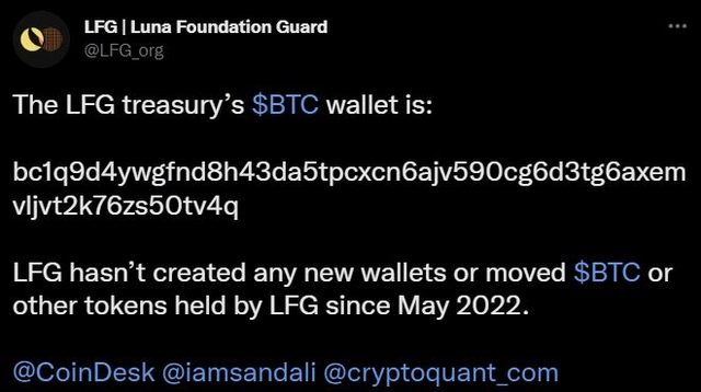루나파운데이션가드(LFG)는 28일 공식 트위터를 통해 LFG 트레져리의 비트코인(BTC) 주소를 게시했다.